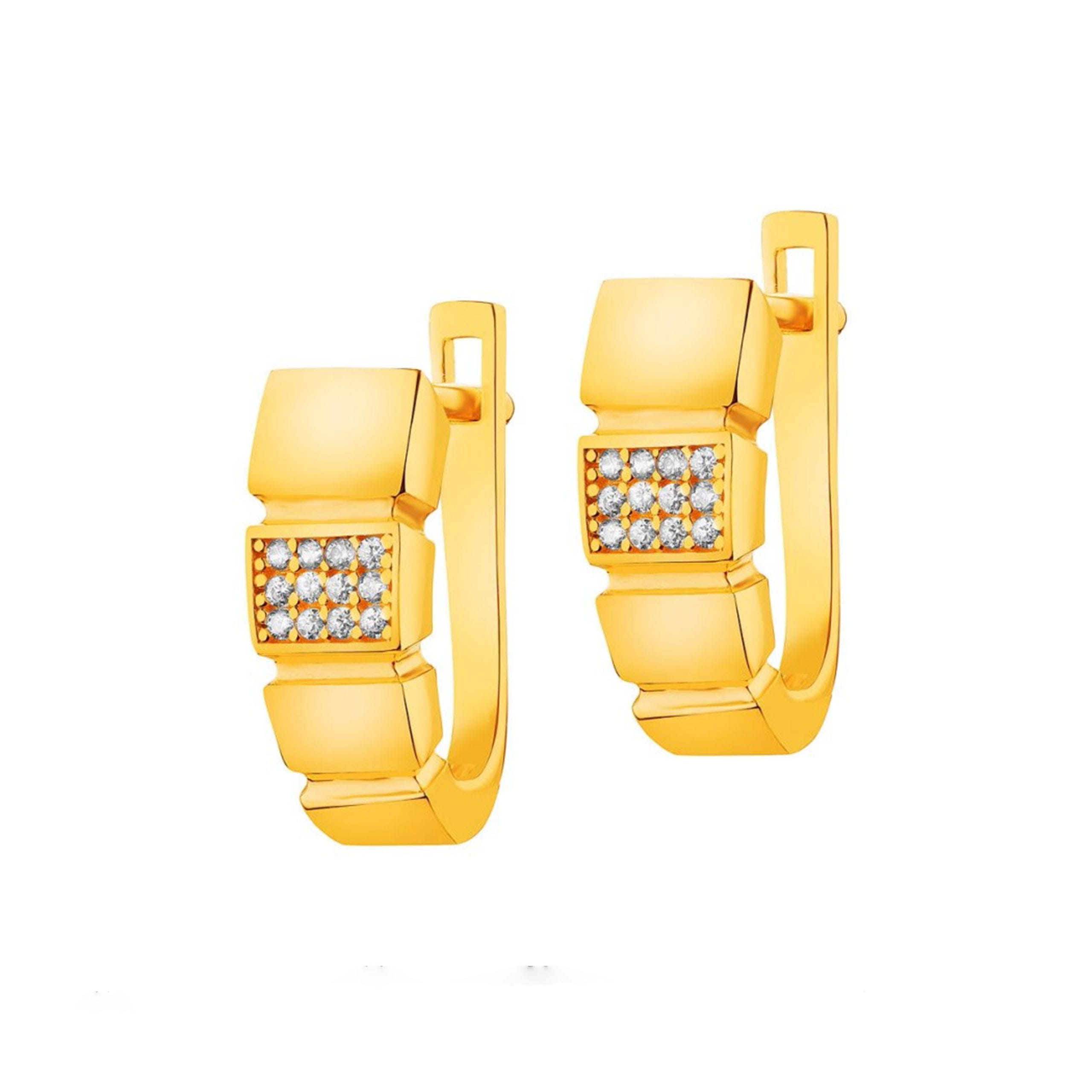 Pozłacane kolczyki z zapięciem angielskim wykonane ze srebra próby 0,925. Podłużny element ozdobny podzielony na segmenty, z których jeden ozdobiono białymi cyrkoniami, które pięknie prezentują się i nadają biżuterii subtelnego blasku. Prosta kompozycja ujmuje ponadczasową elegancją oraz precyzją wykonania, a bezpieczne zapięcie angielskie sprawia, że detale pięknie prezentują się na uchu. Prezentowany model kolczyków przeznaczony jest dla dorosłych kobiet oraz nastolatek.